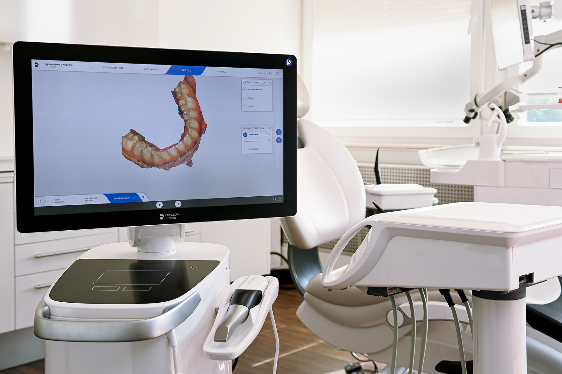 Unser Plus für Sie: Dank des Einsatzes eines modernen Intraoralscanners ist die Herstellung von Zahnersatz in unserer Praxis komplett abdruck- und schmerzfrei möglich.