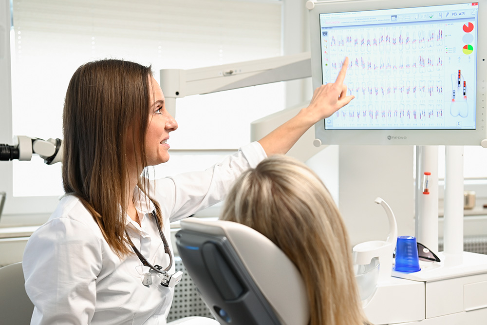 Bei jedem Ihrer (Kontroll-)Besuche behalten wir als Allgemeinzahnärzte mit Zusatzausbildungen Ihren persönlichen Zahnstatus im Blick. Sollte dabei etwas auffallen, entwickeln wir Ihr persönliches Behandlungskonzept. Dabei setzen wir vor allem auf drei Dinge: absolute Transparenz, einen vertrauensvollen Umgang und tiefgreifendes Fachwissen. Ihre Diagnose erläutern wir Ihnen mithilfe unserer großen Bildschirme und Tablets oder am digitalen Modell.