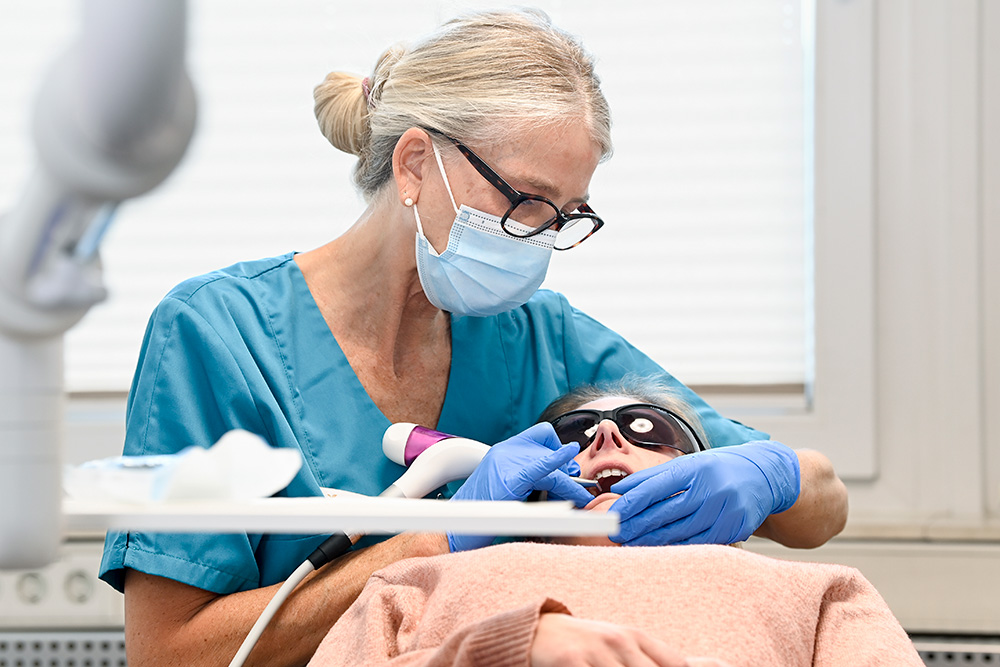Das Ziel der systematischen Parodontitistherapie ist, einen entzündungsfreien Mundraum zu schaffen und weiteren Knochenverlust zu stoppen bzw. stark zu verlangsamen. Diese Behandlung ist vor allem dann sehr erfolgversprechend, wenn Zahnarzt, Prophylaxeteam und Patient*in zusammenarbeiten! Durch die modernen Techniken und aufgrund unserer klinischen Erfahrung behandeln wir Sie schonend, schmerzfrei und erfolgversprechend gemäß unserem obersten Ziel, Ihr gesundes Lächeln zu erhalten.